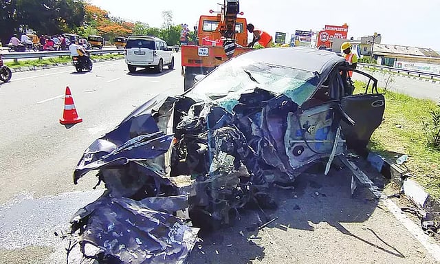 அதனால் கட்டுப்பாட்டை இழந்த கார் தாறுமாறாக சென்று சாலையின் நடுவே உள்ள தடுப்பை (சென்டர் மீடியன்) தாண்டி மறுபுறம் உள்ள பெங்களூரு- சென்னை தேசிய நெடுஞ்சாலைக்குள் பாய்ந்தது. அப்போது பெங்களூருவில் இருந்து சரக்கு ஏற்றிக்கொண்டு சென்னைக்கு சென்று கொண்டிருந்த லாரி மீது கார் நேருக்கு நேர் மோதியது. இதில் காரின் முன்பகுதி அப்பளம்போல் நொறுங்கியது.
