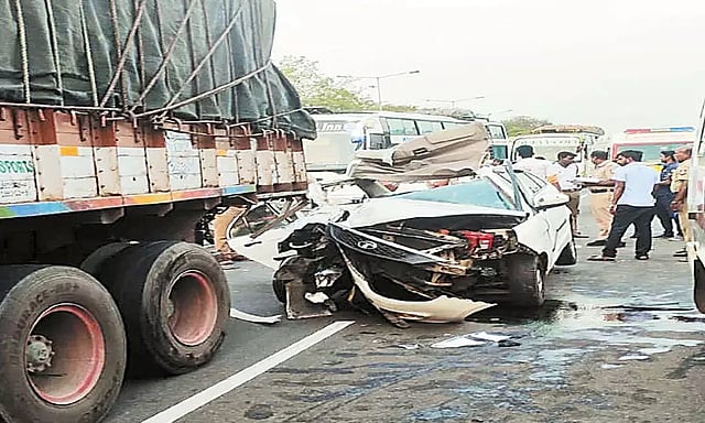 சென்னை தரமணியை சேர்ந்தவர் அழகு ராணி (வயது 63). இவர் உள்பட 4 பேர் நேற்று காலை சேலத்தில் இருந்து சென்னை நோக்கி காரில் வந்துகொண்டிருந்தனர். காரை தென்காசியை சேர்ந்த டிரைவர் ஜெரின் பென்சம்(45) ஓட்டினார். மறைமலைநகர் அடுத்த வல்லாஞ்சேரி ஜி.எஸ்.டி. சாலையில் கார் வரும்போது கேரளாவில் இருந்து மரக்கட்டைகளை ஏற்றிக்கொண்டு தாம்பரம் நோக்கி முன்னால் சென்று கொண்டிருந்த லாரியின் பின்புறத்தில் கார் கண்ணிமைக்கும் நேரத்தில் பயங்கரமாக மோதியது. இதில் கார் அப்பளம் போல் நொறுங்கியது.