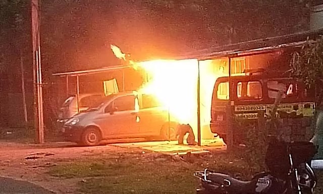 இதைப்பார்த்த செல்வம் தனது மகன் ஸ்ரீநிவாசுடன் சேர்ந்து அதனை சரிசெய்ய முயன்றார். அப்போது கார் திடீரென தீப்பிடித்து எரிந்தது. இதில் அவாகளுக்கு தீக்காயம் ஏற்பட்டது. அவர்களை அக்கம் பக்கத்தினர் மீட்டு சிகிச்சைக்காக என்.எல்.சி.மருத்துவமனைக்கு அனுப்பி வைத்தனர்.
