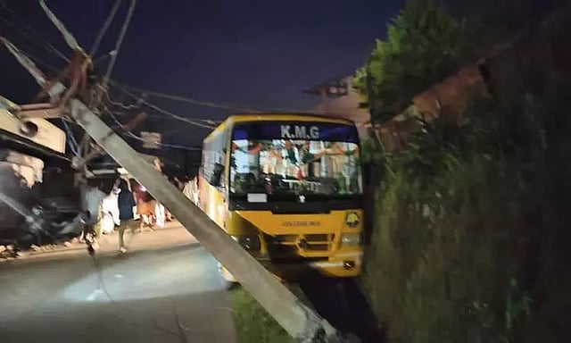 வால்பாறை பகுதியைச் சேர்ந்த மாணவ -மாணவிகள் அங்கலக்குறிச்சி பகுதியில் உள்ள ஒரு தனியார் கல்லூரியில் படித்து வருகின்றனர்.இவர்கள் தினந்தோறும் வால்பாறையிலிருந்து கல்லூரிக்கு வந்து செல்வதற்காக கல்லூரி நிர்வாகம் கல்லூரி பஸ் இயக்கி வருகிறது. இந்த நிலையில் நேற்று அங்கலக்குறிச்சியில் உள்ள கல்லூரியிலிருந்து மாணவ, மாணவிகளை ஏற்றிக் கொண்டு கல்லூரி பஸ் வால்பாறைக்கு சென்றது.பஸ்யை வால்பாறை அண்ணா நகர் பகுதியைச் சேர்ந்த டிரைவர் சுரேஷ் (வயது 35) ஓட்டிச் சென்றுள்ளார். வால்பாறைக்கு சென்றவுடன் மாணவ -மாணவிகளை டவுன் பகுதியில் இறக்கி விட்டு விட்டு அண்ணா நகர் அருகில் நடுமலை ரோடு பகுதியில் பஸ்யை நிறுத்துவதற்கு சென்ற போது எதிர்பாராத விதமாக சாலையோரத்தில் இருந்த உயர் மின்னழுத்த மின் கம்பத்தில் மோதியது. இதில் மின் கம்பம் இரண்டாக முறிந்து சாய்ந்தது. இந்த விபத்தில் அதிர்ஷ்டவசமாக யாருக்கும் எந்த வித பாதிப்பும் ஏற்படவில்லை. ஆனால் வால்பாறை பகுதி முழுவதும் மின் விநியோகம் தடைப்பட்டது. இதுபற்றி அறிந்ததும் மின் வாரிய பொறியாளர்கள் மின் வாரிய பணியாளர்களுடன் அங்கு சென்று, மின் விநியோகத்தை சரி செய்யும் பணியில் ஈடுபட்டனர். இந்த சம்பவம் குறித்து வால்பாறை போலீசார் விசாரணை நடத்தி வருகின்றனர்.