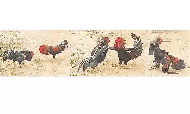 'என்னடா குறுகுறுன்னு பார்க்கிற..., நிமிர்ந்து நேரா பார்த்தால் மட்டும் பயந்துவிடுவோமா?... ஓங்கி மிதித்தால் மல்லாக்க படுத்து சைக்கிள் ஓட்டிருவ...' என்ற எண்ண ஓட்டத்தைப்போன்று 2 சேவல்கள் அனல்பறக்க சண்டையிட்டு கொண்டன. அரியலூர் மாவட்டத்தில் உள்ள தா.பழூரில் சாலையோரத்தில் மேய்ந்தபோது திடீரென அந்த சேவல்கள் சண்டையிட்டன.