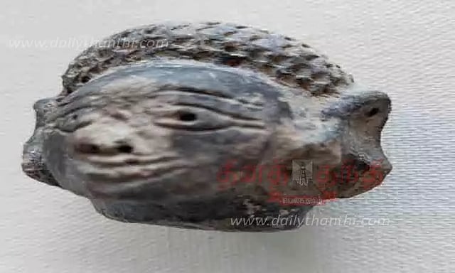 வெம்பக்கோட்டை தாலுகா விஜய கரிசல்குளம் பகுதியில் நடைபெற்று வரும் 2-ம் கட்ட அகழாய்வில் ஆண் உருவ சுடுமண் பொம்மை கண்டெடுக்கப்பட்டுள்ளது. இந்த பாம்மை கருப்பு நிறத்துடன் வடிவமைக்கப்பட்டுள்ளது. தலை அலங்காரமும், உதட்டுச் சிரிப்பும் மெருகுற்றுகிறது. கயல் வடிவில் அமைந்த கண்களும், அவற்றின் புருவங்களும் கீரல் வடிவில் வரையப்பட்டுள்ளது. வாய், மூக்கு, காதுகள், தடிமனாக உருவாக்கப்பட்டுள்ளது. இதுவரை 12 அகழாய்வு குழிகள் தோண்டப்பட்டு பணிகள் விறுவிறுப்பாக நடைபெற்று வருகின்றன. இதில் 2,452 பொருட்கள் கண்டெடுக்கப்பட்டுள்ளது. இதன் மூலம் கீழடியில் நடைபெற்று வரும் அகழாய்விற்கு இணையாக பொருட்கள் கிடைத்து வருவதாக தொல்லியல் துறை அதிகாரிகள் தெரிவித்தனர்.