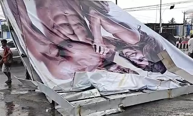 காற்றில் தூக்கி வீசப்பட்ட பெயர் பலகை உயர் மின்னழுத்த கம்பியில் விழுந்து, கீழே நின்று கொண்டிருந்த காரின் மீது விழுந்தது. இதில் காரின் கண்ணாடி உடைந்து சேதமடைந்தது. அதிர்ஷ்டவசமாக இந்த விபத்தில் யாருக்கும் எந்த வித காயமோ, உயிரிழப்போ ஏற்படவில்லை.