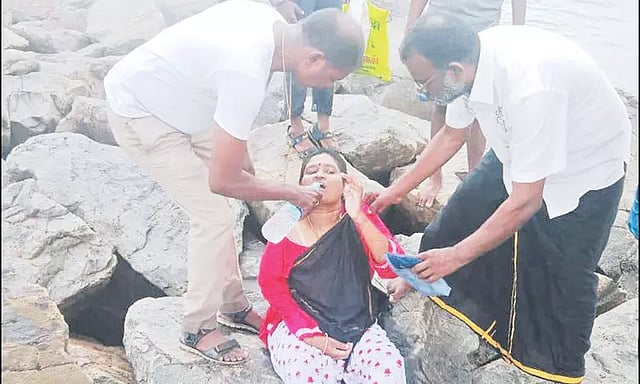 தேவிகா-சதீஷ்குமார் இருவரையும் போலீஸ் நிலையம் அழைத்து வந்து விசாரணை நடத்தினர். தொழிலில் நஷ்டம் ஏற்பட்டதால் கடலில் குதித்து தற்கொலை செய்ய வந்ததாக தெரிவித்தனர். அவர்களுக்கு மீன்பிடித்துறைமுக ஆய்வாளர் பிரான்வின் டேனி அறிவுரை கூறி எச்சரிக்கை செய்து அனுப்பிவைத்தார்.