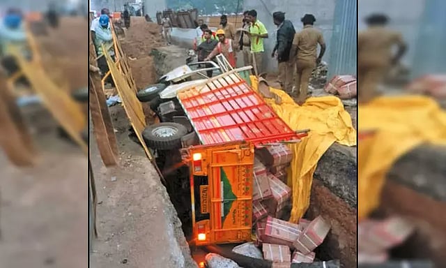 திருவண்ணாமலை மாவட்டம் போளூர் அடுத்த காளசமுத்திரம் பகுதியை சேர்ந்தவர் ராஜேஷ் (வயது 22). லோடு வேன் டிரைவரான இவர், நேற்று காலை போரூரில் இருந்து லோடு வேனில் அரிசி மூட்டைகளை ஏற்றி கொண்டு பூந்தமல்லி நோக்கி சென்று கொண்டிருந்தார். போரூர், அய்யப்பந்தாங்கல் அருகே மெட்ரோ ரெயில் பணிகள் நடைபெற்று வரும் நிலையில், அதன் அருகில் உயர் அழுத்த மின்சார வயர்கள் பூமியில் பதிக்கும் பணிகள் நடைபெற்று வருகிறது. இதற்காக அந்த பகுதியில் 6 அடி ஆழத்திற்கு பள்ளம் தோண்டப்பட்டுள்ளது. இந்த நிலையில் அப்பகுதியில் வந்தபோது, கட்டுப்பாட்டை இழந்த லோடு வேன் திடீரென தடுப்பை உடைத்து கொண்டு 6 அடி பள்ளத்துக்குள் கவிழ்ந்தது.