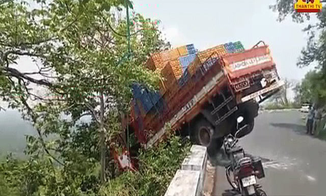 ஏழாவது கொண்டை ஊசி வளைவு அருகே லாரி சாலையில் சென்ற போது திடீரென கட்டுப்பாட்டை இழந்து மலைப்பாதை ஓரம் அமைக்கப்பட்டுள்ள தடுப்புச் சுவரை உடைத்துக் கொண்டு அப்பகுதியில் இருந்த மரத்தின் மீது மோதி விபத்துக்குள்ளானது.
