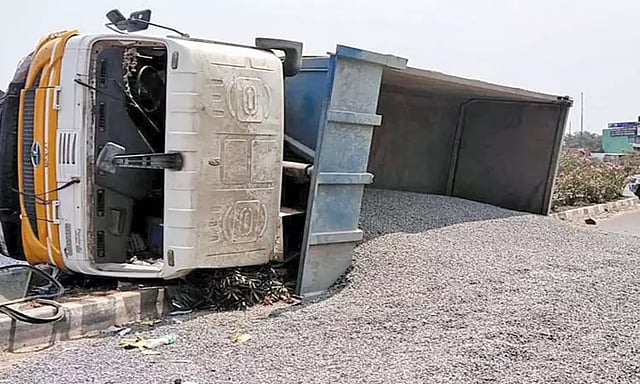 லாரி ஒரகடம் அடுத்த மாத்தூர் பகுதியில் சென்று கொண்டிருந்த போது சாலையை கடக்க வந்த கார் மீது மோதி பின்னர் டிரைவரின் கட்டுப்பாட்டை இழந்த லாரி சாலையின் நடுவே கவிழ்ந்து விபத்துக்குள்ளானது. இதில் லாரியில் இருந்து ஜல்லி கற்கள் சாலையில் சரிந்தது.