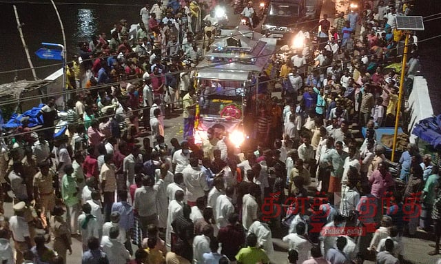 பின்னர் கூத்தாநல்லூர் தீயணைப்பு நிலையம் அருகே உள்ள மரக்கடை சாலையில் இருந்து அமரர் ஊர்தியில் முத்துக்குமரன் உடல் வைக்கப்பட்டு ஊர்வலமாக எடுத்து செல்லப்பட்டது. அப்போது அமரர் ஊர்தியில் வைக்கப்பட்டு இருந்த முத்துக்குமரன் உடலை பார்த்து அங்கு கூடி இருந்த மக்கள் கதறி அழுதனர். அவரது உடல் வைக்கப்பட்ட அமரர் ஊர்தி முத்துக்குமரன் வீட்டை அடைந்தது. இதனைத்தொடர்ந்து அவரது உடல் வீட்டுக்குள் கொண்டு செல்லப்பட்டது.