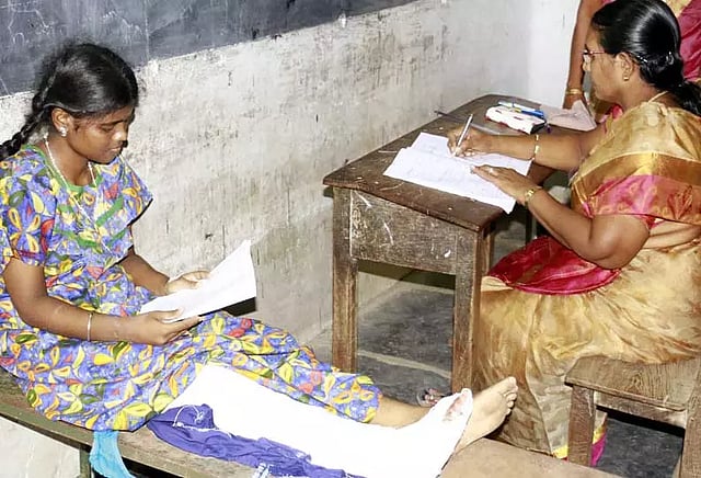 இதையடுத்து டாக்டர்கள் ஆலோசனை செய்து, அம்மாணவிக்கு காலில் மாவுக்கட்டுப்போட்டு ஆம்புலன்ஸ் மூலம் தேர்வு மையத்துக்கு அனுப்பி வைத்தனர். காலை 10.45 மணிக்கு வந்த மாணவி ஷர்மிளா, தனக்கு நேர்ந்த விபத்து குறித்து அங்கிருந்த ஆசிரியர்களிடம் எடுத்துரைத்தார். அதன் பின்னர் ஷர்மிளாவுக்கு தரைத்தளத்தில் தனி அறை ஒதுக்கப்பட்டு அவர் சொல்வதை எழுதுவதற்காக ஒரு ஆசிரியரும் பணியில் அமர்த்தப்பட்டார். அதன்படி மாணவி, கேள்வியை படித்து பார்த்து அதற்குரிய பதில் கூற அதை ஆசிரியர், விடைத்தாளில் எழுதினார். ஷர்மிளாவுக்கு தேர்வு எழுத கூடுதலாக ஒரு மணி நேரம் வழங்கப்பட்டது. விபத்தில் சிக்கிய மாணவி மன தைரியம் மற்றும் விடாமுயற்சியுடன் வந்து தேர்வு எழுதியதை கண்டு சக மாணவிகள் அவரை வெகுவாக பாராட்டினர்.