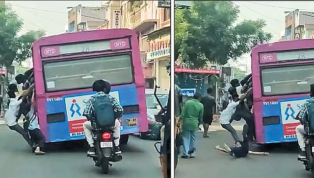 இதனால் பஸ்சின் இரண்டு பக்க படிக்கட்டுகளிலும் மாணவர்கள் தொங்கியபடி சென்றனர். பின்பக்க படிக்கட்டில் அரசு பள்ளி மாணவர் ஒருவரும் தொங்கியபடி பயணம் செய்தார்.