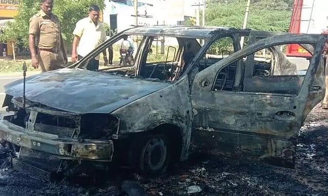 கம்மாபுரம் அருகே உள்ள கீழ்வளையமாதேவியை சேர்ந்தவர் ராஜ்மோகன்(வயது 38). இவர், தனது குடும்பத்தினர் 4 பேருடன் காரில் கீழ்வளையமாதேவியில் இருந்து விருத்தாசலம் நோக்கி நேற்று புறப்பட்டார். கோ.ஆதனூரில் வந்தபோது காரில் உள்ள ஏ.சி.யை ராஜ்மோகன் ஆன் செய்துள்ளார். அப்போது திடீரென கா என்ஜினில் இருந்து தீப்பொறி ஏற்பட்டு, கரும்புகை வெளியேறியது. இதை பார்த்து அதிர்ச்சி அடைந்த ராஜ்மோகன், சாலையோரத்தில் காரை நிறுத்தினார். பின்னர் அதில் இருந்தவர்கள் காரில் இருந்து கீழே இறங்கி ஓடிவிட்டனர். அடுத்த சில நொடிகளில் கார், தீப்பிடித்து எரிந்தது. இந்த தீ கார் முழுவதும் பரவி கொழுந்து விட்டு எரிந்தது. இது பற்றி தகவல் அறிந்ததும் விருத்தாசலம் தீயணைப்பு வீரர்கள் விரைந்து வந்து தண்ணீரை பீய்ச்சி அடித்து தீயை அணைத்தனர். இருப்பினும் அந்த கார் முழுவதும் தீப்பிடித்து எரிந்து எலும்பு கூடுபோல் காட்சி அளித்தது. இது பற்றி தகவல் அறிந்ததும் கம்மாபுரம் போலீசார் நேரில் வந்து விசாரணை நடத்தினர்.