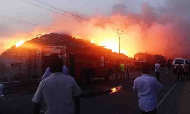 இதனால் கரூர்-வாங்கல் சாலையில் போக்குவரத்து நிறுத்தப்பட்டது. மேலும் அந்தசாலையில் போலீசார் தடுப்புகள் அமைத்து வாகன போக்குவரத்தை திருப்பி விட்டனர். தொடர்ந்து தீயை அணைக்கும் முயற்சியில் தீயணைப்பு வீரர்கள் போராடி வருகின்றனர்.