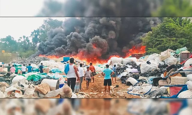 காஞ்சீபுரம் மாவட்டம் படப்பை அருகே உள்ள வரதராஜபுரம் பகுதியில் சுமார் ஒரு ஏக்கர் பரப்பளவில் தனியாருக்கு சொந்தமான பழைய பொருட்கள் மற்றும் பிளாஸ்டிக் பொருட்கள் சேமிக்கும் குடோன் உள்ளது. இந்த குடோனில் இருந்து நேற்று மதியம் 2 மணியளவில் கரும்புகை வந்தது. குடோனில் உள்ள பிளாஸ்டிக் பொருட்கள் மளமளவென எரியத் தொடங்கியது.