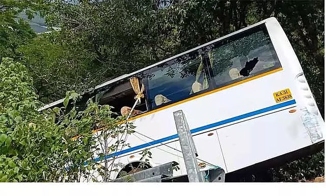 ஒரு கட்டத்தில், வலதுபுறத்தில் உள்ள தடுப்புச்சுவரை உடைத்து பள்ளத்தில் பாய்ந்து அந்தரத்தில் தொங்கியபடி பஸ் நின்றது. இதனைக்கண்ட சுற்றுலா பயணிகள் அபயகுரல் எழுப்பினர்.
