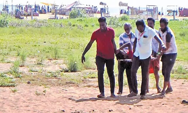 மகாளய அமாவாசையையொட்டி நேற்று மாமல்லபுரம் கடற்கரை பகுதி மற்றும் புஷ்கரணி தெப்பக்குளத்தில் பலர் தங்கள் முன்னோர்களுக்கு தர்ப்பணம் கொடுத்தனர். அப்போது சென்னையை சேர்ந்த 60 வயது மூதாட்டி ஒருவர் தர்ப்பணம் கொடுக்க தங்கள் உறவினர்களுடன் கடற்கரை பகுதிக்கு வந்தார். அப்போது அவருக்கு திடீரென மாரடைப்பு ஏற்பட்டது. கடற்கரையில் இருந்தவர்கள் உடனடியாக 108 ஆம்புலன்சுக்கு தகவல் தெரிவித்தனர். மணல் பரப்பு ஆதலால் ஆம்புலன்சால் கடற்கரைக்கு செல்ல முடியவில்லை. அங்குள்ள நுழைவு வாயில் பிரதான சாலையில் ஆம்புலன்சு நிறுத்தப்பட்டு பணியாளர்கள் பல மீட்டர் தூரம் மணல் பரப்பிலேயே நடந்து சென்று உயிருக்கு போராடிய மூதாட்டியை ஸ்டிரச்சரில் வைத்து தூக்கி வந்தனர். ஆம்புலன்ஸ் ஊழியர்களின் சேவை காண்போரை நெகிழச்செய்தது எனலாம். இனியாவது அரசு காலம் தாழ்த்தாமல் மாமல்லபுரம் கடற்கரை பகுதிக்கு செல்ல உடனடியாக சாலை வசதி ஏற்படுத்தி தர வேண்டும் என்ற கோரிக்கை பொதுமக்களிடமும், சுற்றுலா பயணிகளிடமும் எழுந்துள்ளது.