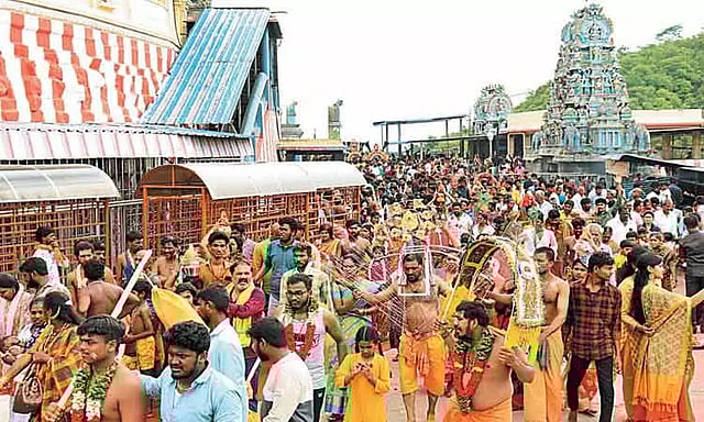 காவடி மண்டபத்தில் உற்சவர் முருகப்பெருமான் வள்ளி தெய்வயானை தாயாருடன் எழுந்தருளி பக்தர்களுக்கு காட்சி அளித்தார். பக்தர்கள் எடுத்து வந்த பால் குடங்கள் பக்தர்கள் முன்னிலையில் பால் அபிஷேகம் செய்யப்பட்டது. ஆடிப்பூர விழாவில் கலந்துகொள்ள சுமார் ஒரு லட்சம் பக்தர்கள் மலைக்கோவிலில் குவிந்ததால் பொதுவழியில் மூலவரை தரிசிக்க 4 மணி நேரமும், 100 ரூபாய் சிறப்பு வழி கட்டணத்தில் ஒரு மணி நேரம் காத்திருந்து தரிசனம் செய்தனர்.