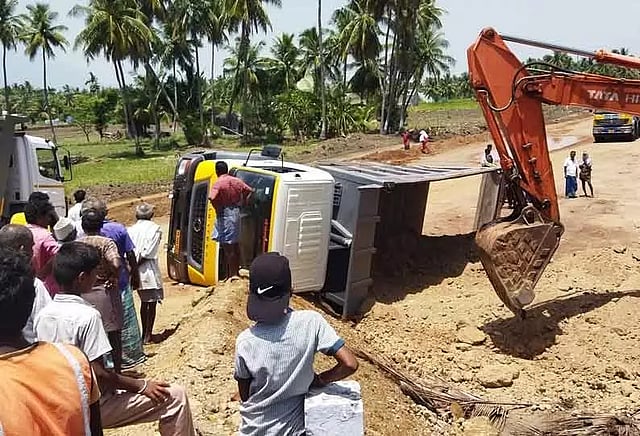 மோகனூரில் இருந்து ராசிபுரம் வரை நாமக்கல், சேந்தமங்கலம், காளப்பநாயக்கன்பட்டி, பேளுக்குறிச்சி ஆகிய பகுதிகள் வழியாக புதிதாக புறவழிச்சாலை அமைக்கும் பணி தீவிரமாக நடந்து வருகிறது. இந்த சாலை பணிக்காக லாரிகள் மூலம் மண் கொண்டு வந்து, கொட்டப்பட்டு வருகிறது. இந்தநிலையில் காளப்பநாயக்கன்பட்டி புதூர்மேடு பகுதியில் சாலை பணிக்காக மண் கொண்டு வந்த லாரி, டிரைவரின் கட்டுப்பாட்டை இழந்து திடீரென சாலையில் கவிழ்ந்தது. இந்த விபத்தில் லாரி டிரைவர் காயமின்றி உயிர் தப்பினார். இதையடுத்து சாலையில் கவிழ்ந்த லாரி மீட்கப்பட்டு, அங்கிருந்து அப்புறப்படுத்தப்பட்டது.