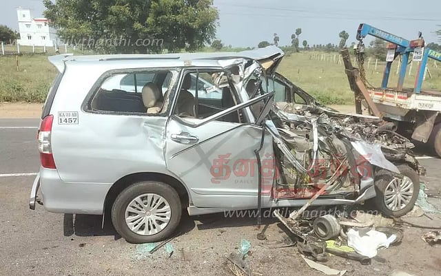 மதுரை அருகே உள்ள திருப்பாலை பகுதியை சேர்ந்தவர் வைத்தியலிங்கம் (வயது 60). இவருடைய மனைவி ஜெயந்தி (55). இவர்களின் மகள் சரண்யா (36) மற்றும் வைத்தியலிங்கத்தின் அக்காள் செண்பகம் (72). இவர்கள் அனைவரும் அமெரிக்காவில் வசித்து வந்தனர். தற்போது இந்தியா வந்துள்ள இவர்கள் மதுரை பகுதியில் உள்ள உறவினர் வீட்டிற்கு வந்து விட்டு நேற்று ஒரு சொகுசு காரில் மதுரையில் இருந்து கர்நாடக மாநிலம், பெங்களூருவில் உள்ள உறவினர் வீட்டிற்கு சென்று கொண்டு இருந்தனர். காரை திண்டிவனத்தை சேர்ந்த டிரைவர் செல்வக்குமார் ஓட்டி வந்தார்.