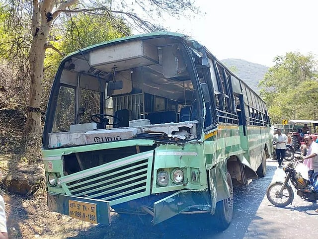 வருசநாடு-தேனி சாலையில் கடமலைக்குண்டு அருகே டாணா தோட்டம் பகுதியில் சென்றபோது, பெண் ஒருவர் மோட்டார்சைக்கிளில் திடீரென சாலையின் குறுக்கே வந்தார். அவர் மீது மோதாமல் இருக்க, தனியார் பஸ் டிரைவர் பிரேக் போட்டார். அப்போது சுமார் 10 அடி இடைவெளியில் பின்னால் வந்து கொண்டிருந்த அரசு பஸ் கண்ணிமைக்கும் நேரத்தில் தனியார் பஸ்சின் பின்புறம் மோதியது. மோதிய வேகத்தில் அரசு பஸ் சாலையின் வலது புறமாக திரும்பியது.