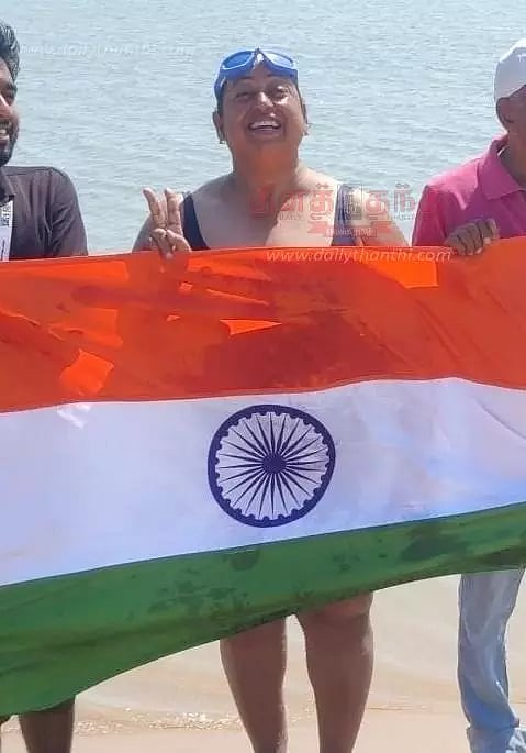 இலங்கை தலைமன்னார் பகுதியில் இருந்து நேற்று முன்தினம் இரவு 10 மணிக்கு நீந்த தொடங்கினார். நேற்று காலை 9 மணிக்கு தனுஷ்கோடி அரிச்சல்முனை பகுதி வந்து தனது நீச்சல் சாதனை பயணத்தை நிறைவு செய்தார். சுமார் 28 கிலோமீட்டர் தூர கடல் பாதையை 9 மணி நேரத்தில் கடந்து சாதனை செய்துள்ளார். இவரை ராமேசுவரம் அனைத்து விசைப்படகு மீனவர் சங்க தலைவர் என்.ஜே. போஸ் உள்ளிட்ட ஏராளமான சுற்றுலா பயணிகள் பாராட்டினர்.