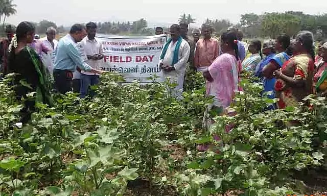 தோகைமலை அருகே உள்ள புழுதேரி இந்திய வேளாண் ஆராய்ச்சி கழக வேளாண் அறிவியல் மையத்தின் சார்பாக பருத்தி சாகுடி குறித்து விவசாயிகளுக்கு செயல்விளக்கம் நடந்தது. இதற்கு வேளாண் அறிவியல் மையத்தின் முதுநிலை விஞ்ஞானி திரவியம் தலைமை தாங்கி பல்வேறு ஆலோசனைகளை வழங்கினார். இதில் தமிழ்நாடு வேளாண் பல்கலைக்கழகம் பருத்தி ஆராய்ச்சி நிலையம் வெளியிட்ட புதிய ரகமான பருத்தி கோ 17 குறித்து முதல்நிலை செயல் விளக்கம் மேற்கொள்ளப்பட்டது. இந்த பருத்தி கோ 17 என்ற ரகமானது 125 நாட்கள் முதல் 130 நாட்களுக்குள் மகசூல் பெறக்கூடிய குறைந்த வயது உடையது ஆகும். மேலும் இந்த ரகம் அடர் நடவு முறைக்கு ஏற்றதாகவும் உள்ளது. ஏற்கனவே விவசாயிகள் நடைமுறையில் உள்ள ரகத்தை காட்டிலும் 18 சதவீதம் கூடுதலாக மகசூல் தரக்கூடியது ஆகும். இதேபோல் பருத்தியை தாக்கக்கூடிய முக்கிய பூச்சிகளுக்கு குறைவான நோய் எதிர்ப்பு திறன் கொண்டது எனவும் எடுத்து கூறப்பட்டது. இதில் விவசாயிகள் மற்றும் பலர் கலந்து கெர்ணடனர்.