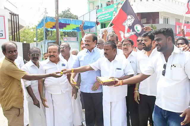 தூத்துக்குடி தெற்குமாவட்ட அதிமுக செயலாளர் எஸ்.பி.சண்முகநாதன் அறிவுறுத்தலின் பேரில் ஸ்ரீவைகுண்டம் ஒன்றிய செயலாளர் காசிராஜன் தலைமையில் ஸ்ரீவைகுண்டம் முத்துராமலிங்க தேவர் சிலை முன்பாக அ.தி.மு.க.வினர் பட்டாசு வெடித்து, பொதுமக்களுக்கு இனிப்பு வழங்கி கொண்டாடினர். இந்நிகழ்ச்சிக்கு நகர செயலாளர் காசிராஜன் முன்னிலை வகித்தார். இதில், கட்சி நிர்வாகிகள் உட்பட பலர் கலந்துகொண்டனர்.