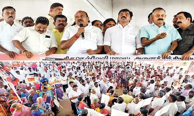 நெல்லை மாவட்ட அ.தி.மு.க. செயலாளர் தச்சை கணேச ராஜா தலைமை தாங்கினார். மாநில அமைப்பு செயலாளர்கள் கருப்பசாமி பாண்டியன், சுதா கே.பரமசிவன், ஏ.கே.சீனிவாசன், அனைத்துலக எம்.ஜி.ஆர். மன்ற துணை செயலாளர் நாராயண பெருமாள், கல்லூர் வேலாயுதம், முன்னாள் எம்.எல்.ஏ.க்கள் ரெட்டியார்பட்டி நாராயணன், ஆர்.பி.ஆதித்தன், கொள்கை பரப்பு துணை செயலாளர் பாப்புலர் முத்தையா, மாவட்ட அவைத்தலைவர் பரணி சங்கரலிங்கம், பொருளாளர் சவுந்தரராஜன், இளைஞர் அணி செயலாளர் பால்துரை, மகளிர் அணிச்செயலாளரும், திசையன்விளை பேரூராட்சி தலைவருமான ஜான்சிராணி, நெல்லை மாநகராட்சி கவுன்சிலர் சந்திரசேகர், முன்னாள் துணை மேயர் ஜெகநாதன் என்ற கணேசன், மாவட்ட எம்.ஜி.ஆர். மன்ற துணைசெயலாளர் உவரி ராஜன் கிருபாநிதி, ஒன்றிய செயலாளர்கள் முத்துக்குட்டி பாண்டியன், கே.பி.கே.செல்வராஜ், பொதுக்குழு உறுப்பினர் செவல் முத்துசாமி, வக்கீல் ஜெயபாலன், ராதாபுரம் மேற்கு ஒன்றிய செயலாளர் அந்தோணி அமலராஜா உள்பட ஏராளமானோர் கலந்து கொண்டனர். அவர்கள் தமிழக அரசை கண்டித்து கண்டன கோஷங்கள் எழுப்பினார்கள்.