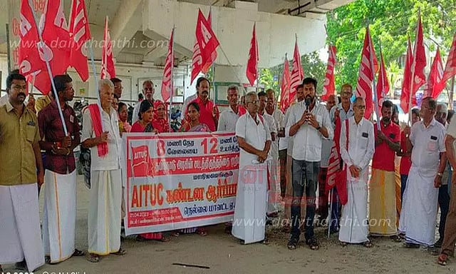 நெல்லை மாவட்ட ஏ.ஐ.டி.யூ.சி. சார்பில் வண்ணார்பேட்டை ரவுண்டானா அருகில் நேற்று கண்டன ஆர்ப்பாட்டம் நடந்தது. மாவட்ட பொது செயலாளர் சடையப்பன் தலைமை தாங்கினார். இந்திய கம்யூனிஸ்டு கட்சியின் மாவட்ட செயலாளர் லட்சுமணன் ஆர்ப்பாட்டத்தை தொடங்கி வைத்து பேசினார். போக்குவரத்து தொழிலாளர்களின் பணி நேரத்தை 8 மணி நேரத்தில் இருந்து 12 மணி நேரமாக மாற்றுவதை கண்டித்து இந்த ஆர்ப்பாட்டம் நடந்தது. ஆர்ப்பாட்டத்தில் ஏ.ஐ.டி.யூ.சி. துணைத் தலைவர் ரங்கன், மாநில குழு உறுப்பினர் முருகன், செயலாளர் முத்துகிருஷ்ணன் மற்றும் நிர்வாகிகள் உலகநாதன், சேதுராமலிங்கம், மணியன் உள்பட பலர் கலந்து கொண்டனர்.