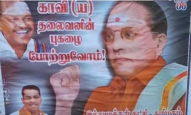 இந்நிலையில், இந்து மக்கள் கட்சி மாநில செயலாளரான டி.குருமூர்த்தி என்பவர் அம்பேத்கர் படத்தில் காவி உடை அணிவித்து, விபூதி பூசியும், குங்குமம் வைத்தும் கும்பகோணம் முழுவதும் போஸ்டர்களை ஒட்டியுள்ளார்.