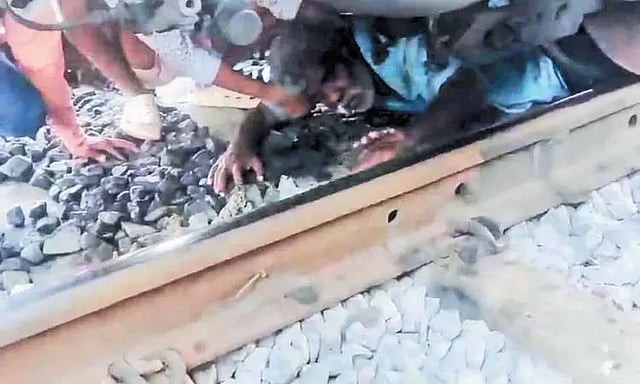 சென்னை கடற்கரையில் இருந்து தாம்பரம் நோக்கி நேற்று மாலை மின்சார ரெயில் வந்து கொண்டிருந்தது. பல்லாவரம் ரெயில் நிலையத்தில் தண்டவாள பகுதியை முதியவர் ஒருவர் கடக்க முயன்ற போது, ரெயில் வருவதை கண்டு அதிர்ச்சியடைந்த அவர் செய்வதறியாது திகைத்த நிலையில் திடீரென தண்டவாளத்தில் படுத்தார். இதைப் பார்த்து திகைத்த ரெயில் என்ஜின் டிரைவர் அவசரமாக பிரேக் பிடித்தார். இருந்தபோதிலும் முதியவர் படுத்து கிடந்த இடத்தை தாண்டி ரெயில் பாதியில் நின்றது. இதனால் முதியவர் ரெயிலுக்கு அடியில் சிக்கி கொண்டார். இதை பார்த்த பொதுமக்கள் அதிர்ச்சியில் அலறினர்.