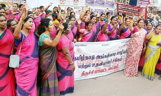மதுரையை சேர்ந்த ஊழியர் அம்சவள்ளியின் சாவிற்கு காரணமானவர்கள் மீது நடவடிக்கை எடுக்கக்கோரி அங்கன்வாடி ஊழியர்கள் மற்றும் உதவியாளர்கள் சங்கத்தினர், திருச்சி கலெக்டர் அலுவலகம் அருகே நேற்று மாலை ஆர்ப்பாட்டத்தில் ஈடுபட்டனர். ஆர்ப்பாட்டத்திற்கு துணைத்தலைவர் அகிலாண்டேஸ்வரி தலைமை தாங்கினார். பொருளாளர் ராணி முன்னிலை வகித்தார். மாவட்ட செயலாளர் சித்ரா விளக்கவுரையாற்றினார். ஊழியர் அம்சவள்ளியின் சாவிற்கு காரணமானவர்களை கைது செய்யக்கோரியும், கொலை வழக்காக பதிவு செய்யக்கோரியும் ஆர்ப்பாட்டத்தின்போது கோஷங்கள் எழுப்பப்பட்டன.