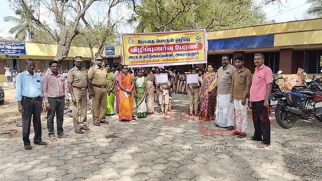 குத்தாலம் அருகே அகராதனூர் அரசு உயர்நிலைப்பள்ளியில் நேற்று போதைப்பொருள் ஒழிப்பு விழிப்புணர்வு ஊர்வலம் நடந்தது. நிகழ்ச்சிக்கு கடக்கம் ஊராட்சி மன்ற தலைவர் சதீஷ் தலைமை தாங்கினார். இதில் பெரம்பூர் போலீஸ் சப்-இன்ஸ்பெக்டர் ராஜேந்திரன், சிறப்பு சப்-இன்ஸ்பெக்டர் முருகன், கிளியனூர் அரசு ஆரம்ப சுகாதார நிலைய சுகாதார ஆய்வாளர் கணேஷ்கர் ஆகியோர் கலந்து கொண்டு போதைப்பொருள் ஒழிப்பு விழிப்புணர்வு ஊர்வலத்தை தொடங்கி வைத்து மாணவ-மாணவிகளுக்கு போதைப்பொருள் ஒழிப்பு குறித்து எடுத்துக்கூறினர். தொடர்ந்து பள்ளி மாணவ-மாணவிகள் போதைப்பொருள் ஒழிப்புக்கான பதாகைகளை ஏந்தி விழிப்புணர்வு ஏற்படுத்தினர். இதில் பள்ளி தலைமை ஆசிரியர் ஐரின் ஜெயராணி, பள்ளி மேலாண்மை குழு தலைவர் ஜான்சிராணி உள்ளிட்ட பள்ளி ஆசிரியர்கள், பெற்றோர்கள், மாணவ-மாணவிகள் உட்பட பலர் கலந்து கொண்டனர்.
