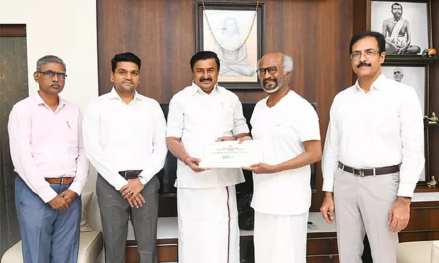 தமிழ்நாடு முதல்-அமைச்சர் மு.க.ஸ்டாலின் சார்பில் தமிழ் வளர்ச்சி மற்றும் செய்தித்துறை அமைச்சர் சாமிநாதன் இன்று சூப்பர் ஸ்டார் ரஜினிகாந்த் இல்லத்திற்கு நேரில் சென்று 13.9.2025 அன்று சென்னை நேரு உள்விளையாட்டு அரங்கத்தில் நடைபெறவுள்ள சிம்பொனி சிகரம் தொட்ட தமிழன் இசைஞானி இளையராஜாவின் பொன்விழா ஆண்டு 50 பாராட்டு விழா-விற்கான அழைப்பிதழை வழங்கினார். அப்போது முதல்-அமைச்சரின் செயலாளர் சண்முகம், தமிழ் வளர்ச்சி மற்றும் செய்தித்துறை செயலாளர் ராஜாராமன், செய்தி மக்கள் தொடர்புத் துறை இயக்குநர் வைத்திநாதன் ஆகியேர் உடனிருந்தனர்.