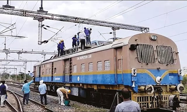 ராணிப்பேட்டை மாவட்டம் அரக்கோணம் ரெயில் நிலையம் அருகே, நேற்று காலை அரக்கோணம் - சென்னை மார்க்கத்தில் செல்லும் உயர் அழுத்த மின் கம்பி அறுந்து விழுந்தது.