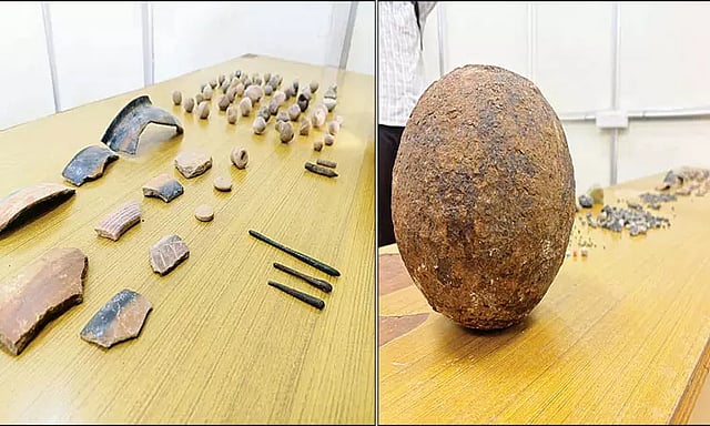 அப்போது 2 ஆயிரம் ஆண்டுகளுக்கு முற்பட்ட சங்க காலத்தில் நெசவுத்தொழில் சிறப்பாக வளர்ந்திருந்ததை காணும் விதமாகவும், நெசவு தொழிலுக்கு பயன்படுத்தப்பட்ட சுடுமண்ணால் ஆன கோள வடிவில் செய்யப்பட்ட துளை வடிவம் கொண்ட தக்களி, சுடுமண் பானை ஓடுகள், பெண்கள் கண்ணிற்கு மை இடுதலுக்கு பயன்படுத்திய செம்பினால் ஆன அஞ்சனக்கோல் உள்ளிட்டவற்றை கண்டுபிடித்துள்ளனர். இந்த அஞ்சனக்கோல் 4.5, 4.8, 8.7 என உயரம் கொண்டவைகளாக கிடைத்துள்ளன.