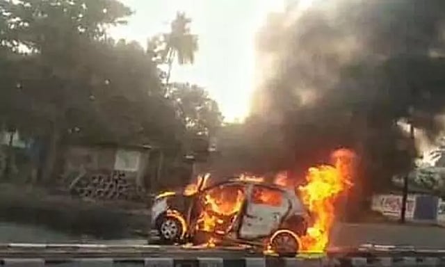 ஆனால், கார் முழுவதும் தீப்பிடித்து எரிந்தது. இதனால், அதிக கரும்புகையும் வெளிவந்தது. இதில் சிக்கி, மூச்சு திணறி ஓட்டல் உரிமையாளர் பலியானார். காரில் இருந்த எரிபொருள் கசிந்ததில் தீப்பற்றி இருக்கலாம் என கூறப்படுகிறது. காரில் இருந்து வெளியேற முடியாமல் அவர் சிக்கி உயிரிழந்து உள்ளார்.