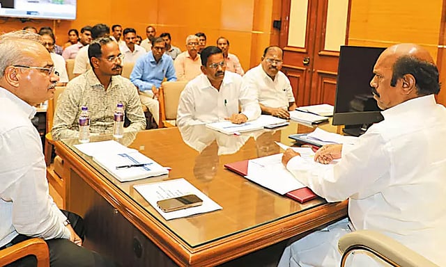 வடகிழக்கு பருவமழை முன்னெச்சரிக்கை நடவடிக்கைகள், வெள்ளத்தடுப்பு பணிகள் குறித்து சென்னை, காஞ்சீபுரம், செங்கல்பட்டு, திருவள்ளூர் மாவட்ட நெடுஞ்சாலைத்துறை அலுவலர்களுடன் நெடுஞ்சாலைத்துறை அமைச்சர் எ.வ.வேலு சென்னை தலைமைச் செயலகத்தில் ஆய்வு மேற்கொண்டார்.