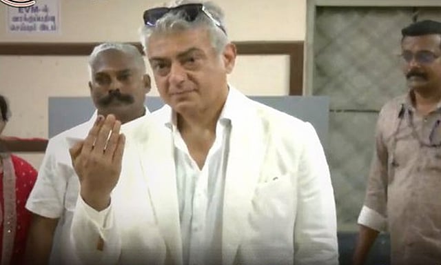 வாக்களிக்க வந்த நடிகர் அஜித்குமார் வெள்ளை நிற கோட் சூட் அணிந்திருந்தார். வாக்களித்துவிட்டு கை விரலில் வைக்கப்பட்ட மை-யை நடிகர் அஜித்குமார் காண்பித்தார். நடிகர் அஜித்தை காண தொண்டர்கள் குவிந்து இருந்தனர். கூட்டத்தை கட்டுப்படுத்துவதற்காக போலீசார் குவிக்கப்பட்டனர்.