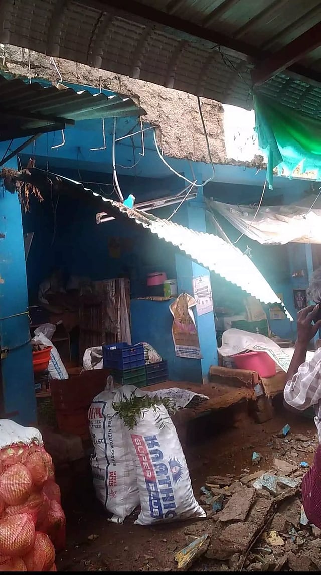 பழனியில் நேற்று இரவு பெய்த மழையால் நகரின் தாழ்வான இடங்களில் தண்ணீர் தேங்கியது. இதற்கிடையே பழனி காந்தி மார்க்கெட் பகுதியில் இன்று காலை வழக்கம் போல் வியாபாரிகள் கடையை திறந்து வியாபாரம் செய்தனர். அப்போது மார்க்கெட்டின் உள்பகுதியில் உள்ள ஒரு கடையின் முன்பக்க மேற்கூரை இடிந்து விழுந்தது. இதையடுத்து அங்கிருந்து வியாபாரிகள் அலறி அடித்து வெளியே ஓடி வந்தனர். நல்ல வேளையாக சுவர் இடிந்து விழுந்தபோது அங்கு யாரும் இல்லாததால் பெரும் சேதம் தவிர்க்கப்பட்டது.