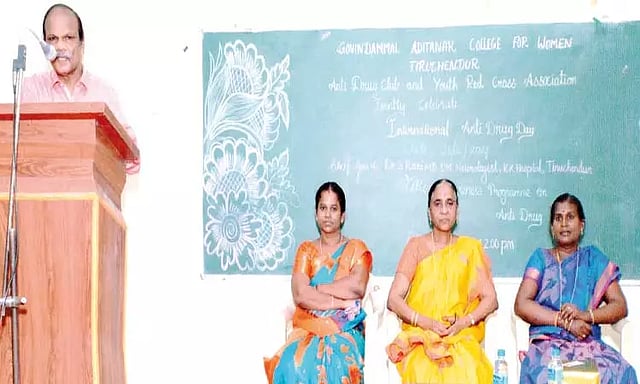 திருச்செந்தூர் கோவிந்தம்மாள் ஆதித்தனார் மகளிர் கல்லூரியில் போதைப்பொருள் எதிர்ப்பு சங்கம், இளைஞர் செஞ்சிலுவை சங்கம் ஆகியவை இணைந்து சர்வதேச போதைப்பொருள் எதிர்ப்பு தின நிகழ்ச்சியை நடத்தின. இந்த நிகழ்ச்சியில் 3-ம் ஆண்டு வேதியியல் துறை மாணவி மு.அஸ்மா மனிகா வரவேற்று பேசினார். கல்லூரி முதல்வர் பொ.ஜெயந்தி தலைமை தாங்கினார். நரம்பியல் நிபுணர் எஸ்.கனி சிறப்பு விருந்தினராக கலந்து கொண்டு, போதைப் பொருள்களை பயன்படுத்துவதால் ஏற்படும் விளைவுகள் குறித்தி விளக்கி பேசினார். தொடர்ந்து போதைப் பொருட்களை பயன்படுத்த மாட்டோம், அவற்றை மற்றவர்களும் பயன்படுத்த அனுமதிக்க மாட்டோம் என்று மாணவியர் உறுதிமொழி எடுத்து கொண்டனர். 3-ம் ஆண்டு வேதியியல் துறை மாணவி மு.ஜெயலட்சுமி நன்றி கூறினார். நிகழ்ச்சிக்கான ஏற்பாடுகளை இளைஞர் செஞ்சிலுவை சங்க ஒருங்கிணைப்பாளர் பூ.ஜமுனா, போதைப்பொருள் எதிர்ப்பு சங்க ஒருங்கிணைப்பாளர் ஜெ.ஆனந்தி பானு, சி.அம்பிகாபதி ஆகியோர் செய்திருந்தனர்.