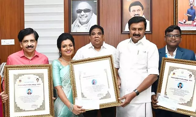 சென்னை, தலைமைச்செயலகத்தில் தமிழ் வளர்ச்சி மற்றும் செய்தித் துறை அமைச்சர் மு.பெ.சாமிநாதனால் முனைவர் வா.கி.சர்வோதய ராமலிங்கம், வேதவள்ளி செகதீசன், ஜோ.அருணோதய சொர்ணமேரி, ப.மோகன்ராஜ் ஆகிய நால்வருக்கும் இன்று (08.09.2025) 2023 - 2024 ஆம் ஆண்டிற்கான சிறந்த தமிழ் உச்சரிப்பு விருதாளர் ஒவ்வொருவருக்கும் ரூ.25,000/-க்கான காசோலையும், பாராட்டுச் சான்றிதழும் வழங்கிச் சிறப்பிக்கப்பெற்றது. இந்நிகழ்ச்சியில் தமிழ் வளர்ச்சி மற்றும் செய்தித் துறை செயலாளர் வே.ராஜாராமன், தமிழ் வளர்ச்சித் துறை இயக்குநர் முனைவர் ந.அருள் மற்றும் அரசு உயர் அலுவலர்கள் கலந்துகொண்டனர்.
