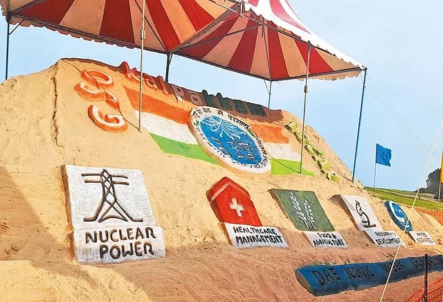 செங்கல்பட்டு மாவட்டம் கல்பாக்கம் பகுதியில் இந்திய அணுசக்தி துறையின் இந்திரா காந்தி அணு ஆராயச்சி மைய வளாகத்தில் பல அணு சார்ந்த துறைகள் செயல்பட்டு வருகிறது. இந்த நிலையில் நேற்று இந்திரா காந்தி அணு ஆராய்ச்சி மையம் மற்றும் பொதுப்பணி துறை நிறுவனம் சார்பில் கல்பாக்கம் நகரிய குடியிருப்பு வளாகத்தில் உள்ள கடற்கரை பகுதியில் அணுசக்தி துறையின் சின்னங்கள் அடங்கிய மணல் சிற்பங்கள் வடிவமைக்கப்பட்டன.