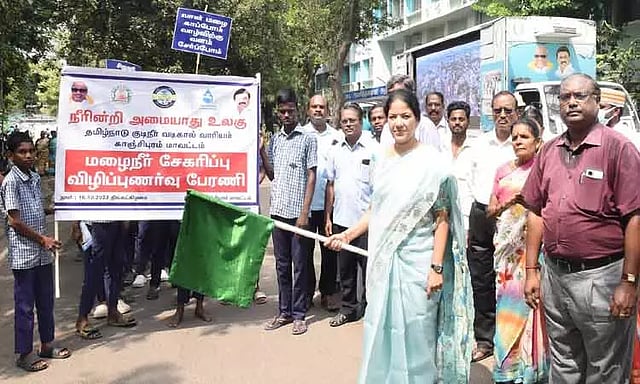 காஞ்சீபுரம் மாவட்டத்தில் வடகிழக்கு பருவமழை தொடங்குவதை ஒட்டி தமிழ்நாடு அரசு சார்பில் மாநிலம் முழுவதும் மழைநீர் சேகரிப்பு திட்டம் மற்றும் மழைநீர் சேகரிப்பு கட்டமைப்புகளை புனரமைப்பது குறித்து பொதுமக்களுக்கு விழிப்புணர்வு ஏற்படுத்தப்பட்டு வருகிறது. காஞ்சீபுரம் மாவட்டத்தில் மக்கள் அதிகம் கூடும் பகுதிகளில் தமிழ்நாடு குடிநீர் வடிகால் வாரியம் சார்பில், பொதுமக்களுக்கு மழைநீர் சேகரிப்பு திட்டம் குறித்து விழிப்புணர்வு ஏற்படுத்தும் பேரணியை மாவட்ட கலெக்டர் கலைச்செல்வி மோகன் கொடியசைத்து தொடங்கி வைத்தார். இதில் பள்ளி மாணவர்கள், அரசு அதிகாரிகள், ஊழியர்கள் கலந்து கொண்டனர்.