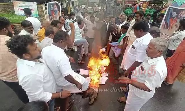 தமிழக விளையாட்டுத்துறை அமைச்சர் உதயநிதி ஸ்டாலின் சமீபத்தில் சனாதனம் குறித்து கருத்து தெரிவித்து இருந்தார். அவரது கருத்துக்கு இந்து அமைப்பினர் எதிர்ப்பு தெரிவித்து வருகின்றனர். குறிப்பாக அயோத்தியை சேர்ந்த பரமஹம்ச ஆச்சாரியார் என்ற சாமியார் அமைச்சர் உதயநிதி ஸ்டாலினை கடுமையாக விமர்சித்து, அவரது தலையை சீவினால் ரூ.10 கோடி தருவதாக அறிவித்தார். இதை கண்டித்து வால்பாறையில் நகர தி.மு.க. சார்பில் ஆர்ப்பாட்டம் நடைபெற்றது. நகராட்சி அலுவலகம் முன்பு நடந்த இந்த ஆர்ப்பாட்டத்தில் சனாதனத்துக்கு எதிராகவும், இந்தியா என்ற பெயரை மாற்றுவதற்கும் கண்டனம் தெரிவித்து கோஷங்கள் எழுப்பப்பட்டது. மேலும் பரமஹம்ச ஆச்சாரியாரின் உருவ பொம்மையை தீ வைத்து எரித்தனர். இதனால் அங்கு பரபரப்பு ஏற்பட்டது.