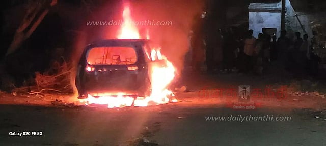 இந்த நிலையில் அவர் நேற்றுமுன் தினம் இரவு வீட்டின் அருகில் தனது காரை நிறுத்திவிட்டு சென்றார். நள்ளிரவில் அவரது கார் தீப்பிடித்து எரிவதாக அக்கம், பக்கத்தினர் கூச்சலிட்டனர்.