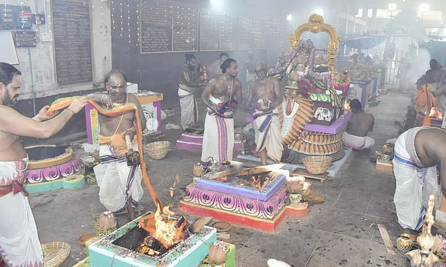 நேற்று அக்னி பிரவேசம், மகா பூர்ணாகுதி, யாத்ரா தானம், கும்பம் புறப்பாடு நடைபெற்று பாலாலயம் நடைபெற்றது. இதில் ஏராளமான பக்தர்கள் கலந்து கொண்டு சாமி தரிசனம் செய்தனர்.