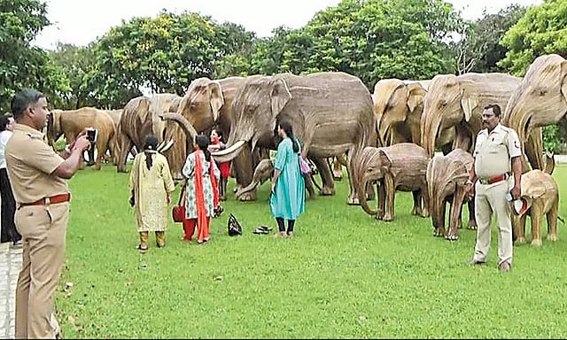 அந்த யானை சிலைகள் தற்போது கடற்கரை கோவில் புல்வெளி வளாகத்தில் வைக்கப்பட்டுள்ளது. குட்டி யானை முதல் பெரிய யானை வரை நிஜ யானைகள் கூட்டம், கூட்டமாக புல்வெளியில் மேய்வது போன்று தத்ரூபமாக ஆங்காங்கு வைக்கப்பட்டுள்ளது.