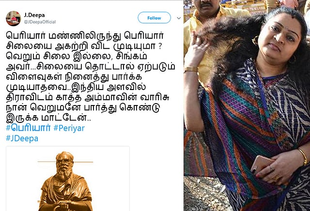 ஜெ.தீபா தன்னுடைய டுவிட்டரில் வெளியிட்டு உள்ள செய்தியில், பெரியார் மண்ணிலிருந்து பெரியார் சிலையை அகற்றி விட முடியுமா? வெறும் சிலை இல்லை, சிங்கம் அவர்... சிலையை தொட்டால் ஏற்படும் விளைவுகள் நினைத்து பார்க்க முடியாதவை.. இந்திய அளவில் திராவிடம் காத்த அம்மாவின் வாரிசு நான் வெறுமனே பார்த்து கொண்டு இருக்க மாட்டேன்.. என பதிவிட்டு உள்ளார். ஜெ.தீபாவின் பதிவை பகிர்ந்துவரும் பலரும் தங்களுடைய கருத்துக்களையும் பதிவு செய்து வருகிறார்கள்.