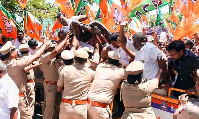 தனியார் திருமண மண்டபத்தில் அவர்களை அடைத்த பின்னர் மண்டபத்தினை போலீசார் பூட்டு போட்டு பூட்டினர். அப்போது பா.ஜ.க.வினருக்கும், போலீசாருக்கும் இடையே பயங்கர வாக்குவாதம் ஏற்பட்டது. மண்டபத்தின் வெளியே நின்று கொண்டிருந்த பொதுமக்கள் மற்றும் பா.ஜ.க.வினரை போலீசார் விரட்டினர். அருகில் உள்ள டீக்கடையில் டீ குடித்துக் கொண்டிருந்தவர்களையும் போலீசார் அங்கிருந்து விரட்டினர்.
