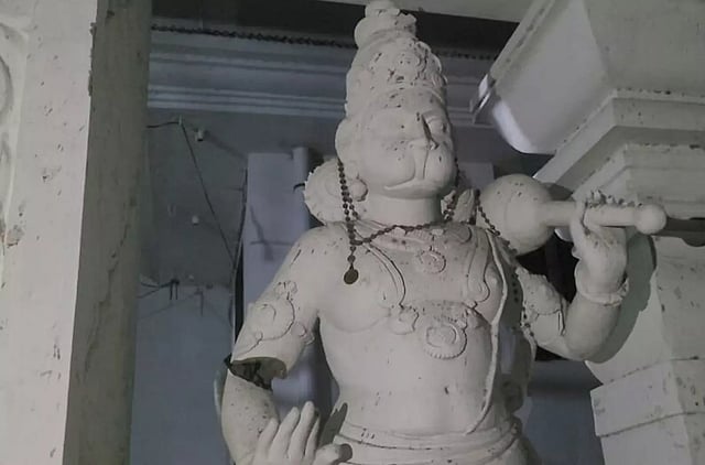 வேலூர் மாவட்டம் குடியாத்தத்தை அடுத்த அம்மணாங்குப்பம் கிராமத்தில் ஆர்.எம்.பி. நகரில் குரு ராகவேந்திரா சுவாமி பிருந்தாவனம் கோவில் உள்ளது. நேற்று மாலையில் ராகவேந்திரா சுவாமி கோவிலுக்கு பக்தர்கள் மற்றும் ஆலய நிர்வாகிகள் வந்துள்ளனர். அப்போது கோவிலின் நுழைவாயிலில் இருந்த ஆஞ்சநேயர் சிலையின் வலது கை சேதப்படுத்தப்பட்டிருந்தது கண்டு அதிர்ச்சடைந்துள்ளனர்.